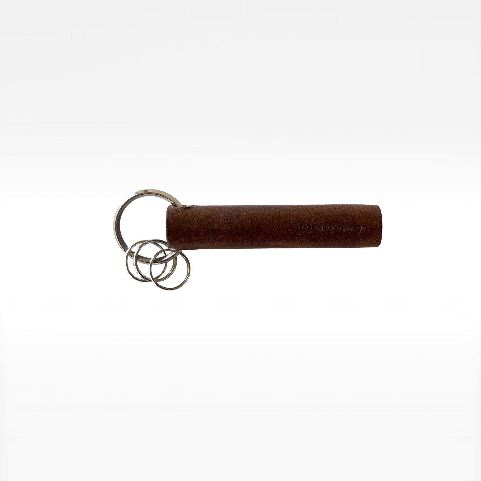 スプリットレザーの重ね方をアレンジし、葉巻のように巻き上げて棒状に仕立てられ、握り持った際に手に収まるサイズ感と、革の質感や手触りが穏やかに感じられるシンプルで美しいキーホルダーです。